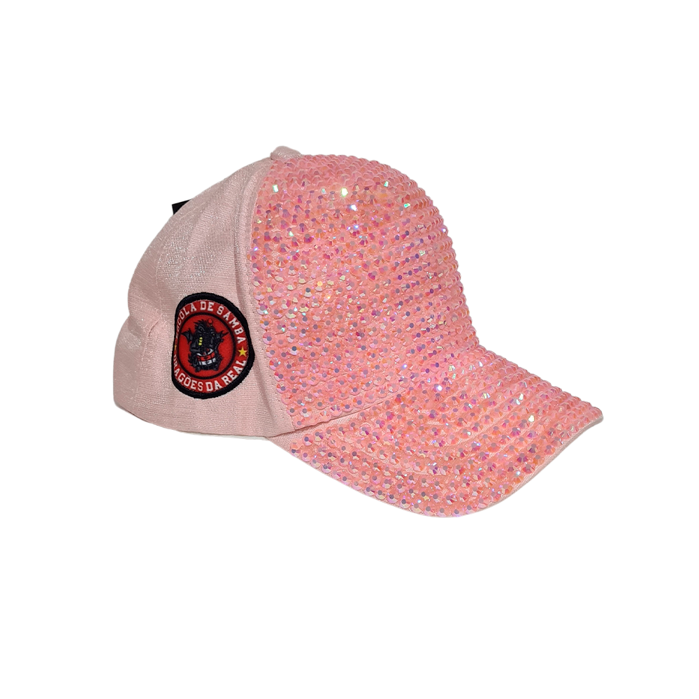Boné rosa com frente inteira em pedras rosas e com logo da Dragões da Real na lateral